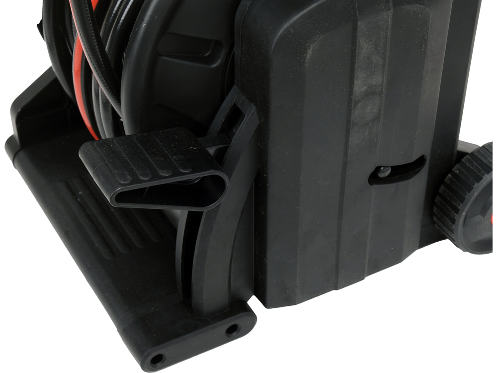 Suportul larg menține stabilitatea căruciorului chiar și în timpul tragerii furtunului. Pedala din material rezistent înfășoară eficient furtunul după terminarea lucrului, fără a-l încurca sau a-l îndoi.